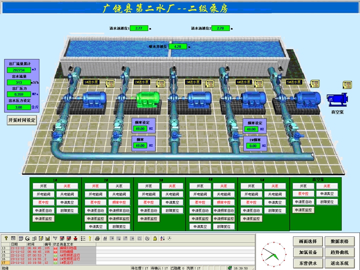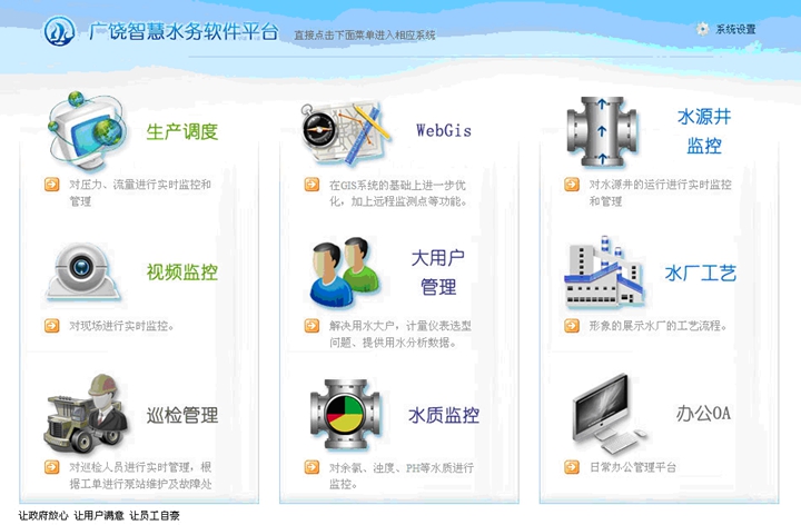 工程規(guī)模:設(shè)計規(guī)模3.5萬噸/日,新建水源井10座,改建原一廠水源井9座,均采用在線遠程監(jiān)測、控制。水廠采用地下水-清水池-消毒-二級泵房的處理工藝。綜合運用GIS技術(shù)、CAD技術(shù)、數(shù)據(jù)庫技術(shù)、網(wǎng)絡技術(shù)、管網(wǎng)綜合調(diào)度系統(tǒng)(SCADA),建設(shè)了廣饒縣GIS給水管網(wǎng)地理信息系統(tǒng),實現(xiàn)城市給水管網(wǎng)數(shù)字化全覆蓋,實現(xiàn)了城市給水全生產(chǎn)過程的信息化管理。
